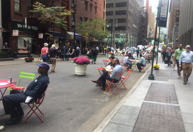 DOT’s model for East 43rd Street is the block-long shared space on Broadway by Madison Square. The agency also tried out temporary shared spaces on Doyers Street and Mott Street in Chinatown over the summer.