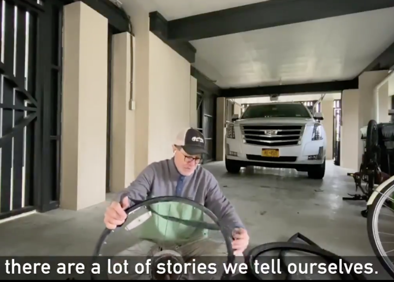It was mildly amusing. But the best part, of course, is pondering the notion of Stephen Colbert on a bike — as a massive white Cadillac SUV looms over him in the garage. (Stephen, that car is absurd! Set an example. There are children watching!)