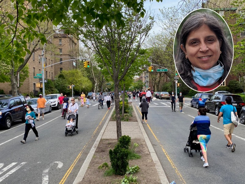 This is the seventh installment in our ongoing series of stories showing support for converting 34th Avenue in Jackson Heights and Corona into a linear park, which is the subject of a petition drive that seeks a logical final conclusion to what the Department of Transportation calls “the gold standard” of open streets. Earlier, we published support from Assembly Member Jessica González-Rojas, Borough President Donovan Richards, urban planner Donovan Finn and City Council candidate Shekar Krishnan, Council Member Danny Dromm, a video by Streetfilms, and from Jackson Heights resident Risa Procton. Today’s piece is by Sharmila Bedi and it comes as the Department of Transportation will soon reveal a plan for redesigning the open street that is expected to fall short of a full car-free conversion and bow to opponents of open space who cherish parking above their neighbors’ lungs and recreation space.